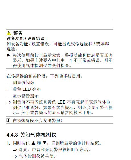 4.6運行準備 6 4.7在運行期間 6 4.7.1測量模式 6 4.7.2 警報 特殊狀態 鎖定警報 刪除峰值 4調出快速菜單 5調出信息 8測量 9 4.6.1帶泵測量時的特點 9 4.6.2帶泵測量 9 4.7配置設備設置 10 4.7.1激活日或夜模式 10 4.7.2更改設備語言 10 4.7.3設置日期及時間 10 4.7.4啟用靜音模式 10 保養 10 5.1維護周期 10 5.2標定間隔 10 5.3執行功能測試 10 5.3.1通過向導進行功能測試 10 5.4標定氣體檢測儀 11 5.4.1進行新鮮空氣標定 11 5.5給電池充電 12 清潔 12 6.1設備設置 13 6.1.1出廠設置 13 6.1.2設備和傳感器設置 13 6.1.3警報設置 14 7 運輸 14 8 儲存 14 9.廢棄處理 14 10.技術數據 14 10.1氣體檢測儀 14 10.2有毒有害物質名稱及含量 15 |